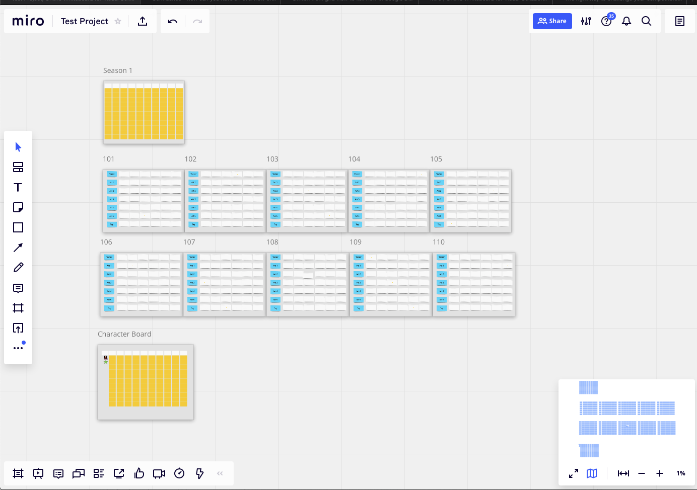Miro's view of the boards after manual setup lasting 8 minutes. Season board, ten separate episode boards, and a character board.