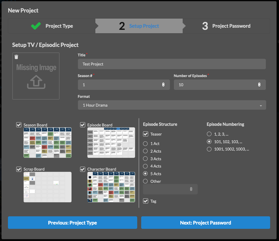 WRITERSROOM PRO - Because it was designed strictly for TV and longform story development, WritersRoom Pro has a dedicated project setup window that allows you to quickly enter the name of your project, what season you're on, the number of episodes, the format, which of the four typical boards you'd like to use, your episodic/story structure, and how you like to number your episodes.