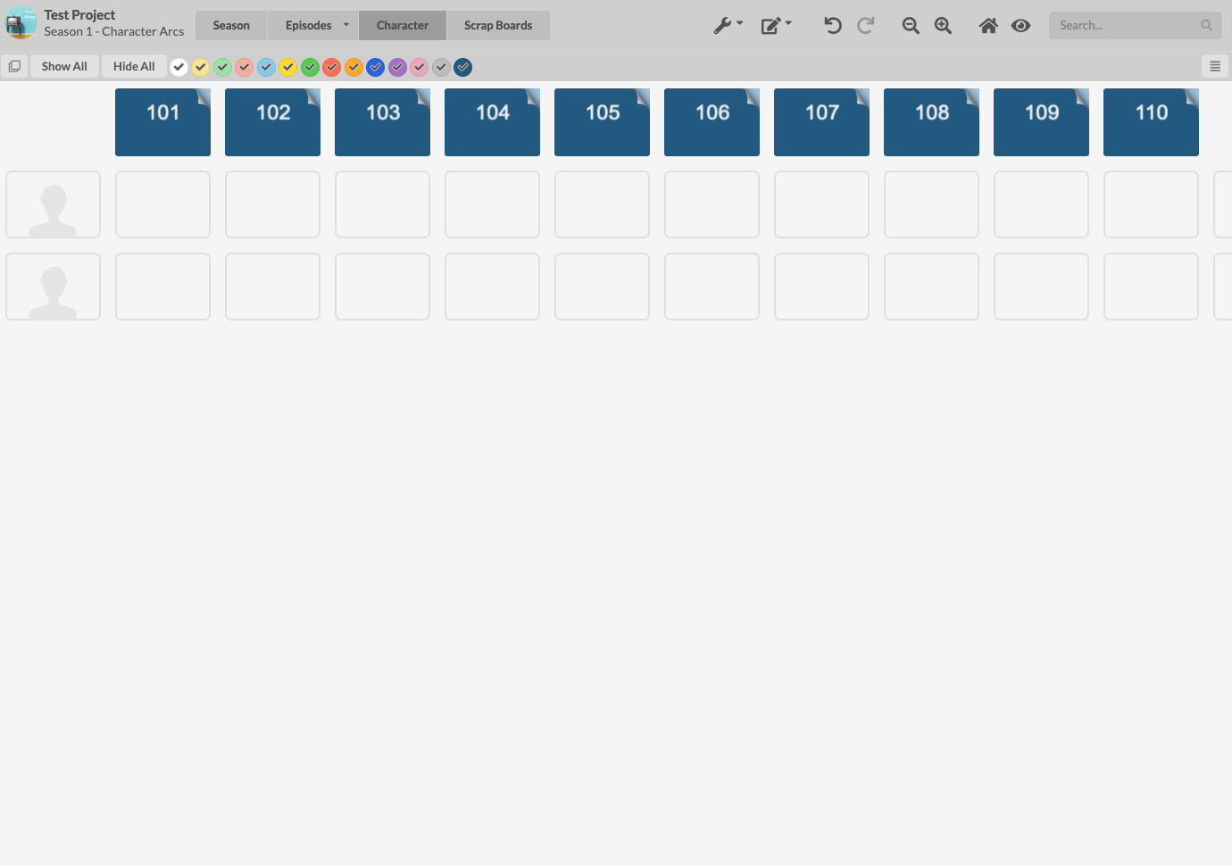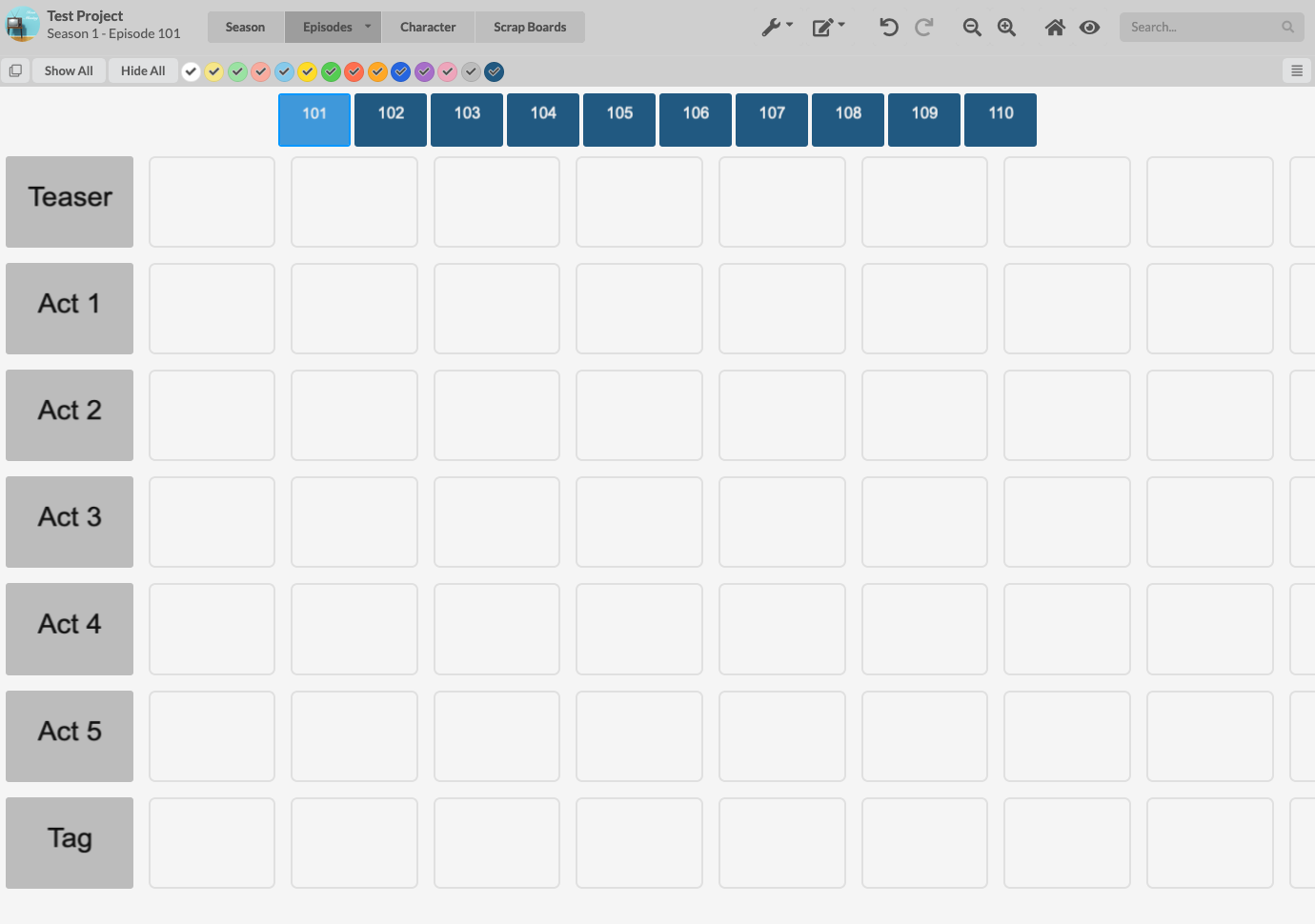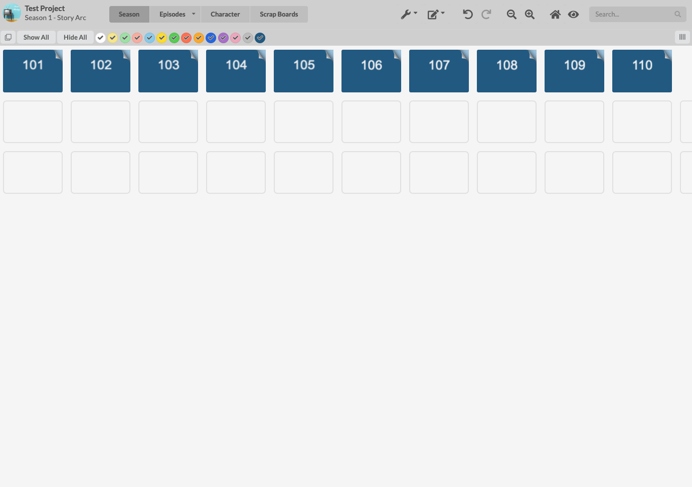 MIRO - To make the comparison fair I asked a current showrunner's assistant who actively uses Miro to set up a blank project comprised of a season board, episodes boards, and a character board for a 10 episode first season show using the numbering convention of 101, 102, 103, etc. The episode structure would be a teaser, five acts, and a tag. I also made things easier for him by showing him what those boards would look like in WritersRoom Pro so he had a visual guide to copy. After almost exactly 8 minutes this is what he built:
