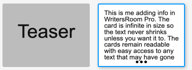 WRITERSROOM PRO - Every card on every board in WritersRoom Pro is the same size, proportionate to a 4x6 index card. Double-clicking an empty placeholder simultaneously creates a card and opens it for editing. While you can change the font size on the card, you don't need to. The cards are infinitely long and you can add as much text as you'd like. If you go below the bottom of the text box, 3 dots appear on the card to show you there's more text than you can see. With the card closed you can long-press on the card to preview the text or open the card and scroll through. The default font size was chosen very deliberately; sooner or later we'll be back in a physical writers' room. The font size is approximately the size of writing on a card with a Sharpie so it's easily readable from ten feet away when WritersRoom Pro will be used on the large displays that are becoming ubiquitous in every writers' room.