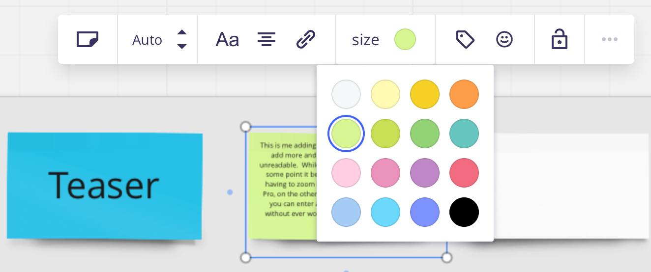 MIRO - Changing and working with card colors on Miro is easy but severely limited. In edit mode you can select one of 16 colors to quickly change the card color.
