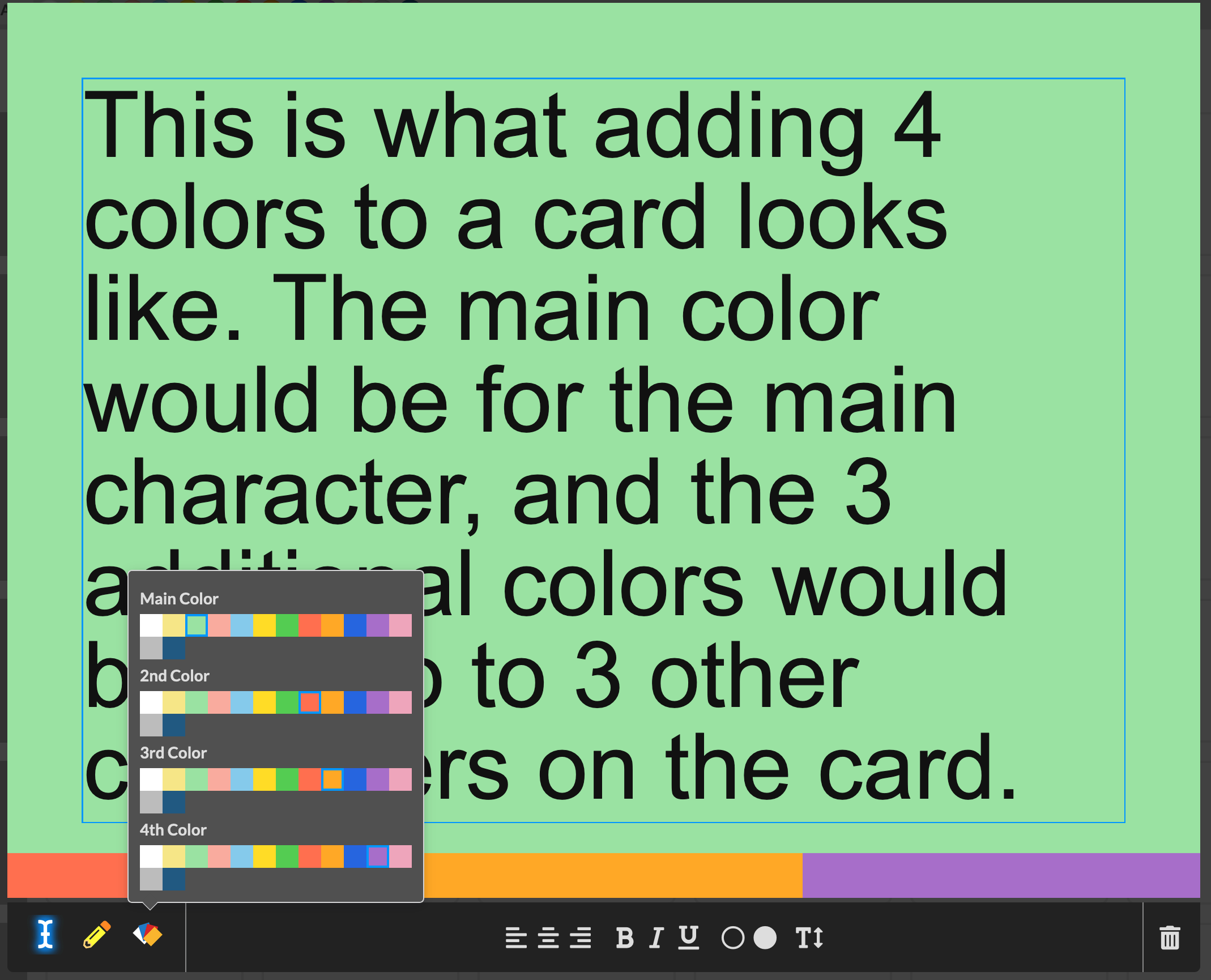 A major feature that WritersRoom Pro has and Miro doesn't is the ability to add up to 4 different colors on a card. This is is an incredibly powerful way to track your characters, assuming you've assigned a specific color to each. Are 2 characters mentioned on the card? Add that second character's color. Three characters? Add the third color. And a fourth if you want. Miro limits you to a single color.