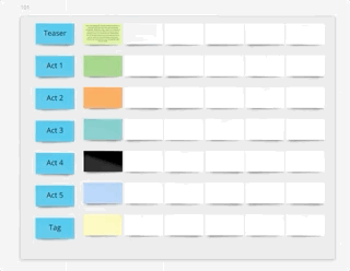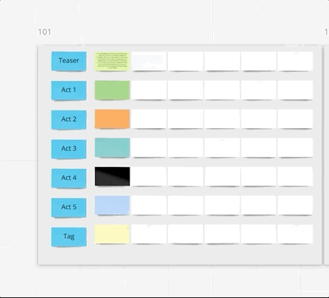 MIRO - Miro allows you to change the orientation of your boards between horizontal (rows) and vertical (columns) however it is a manual operation wherein you have to select the cards and then pivot them by hand. The biggest issue is that when you do this Miro reverses the order of the cards which makes this feature useless. For example, flipping orientation changes all the acts so that the Tag is now in the first column, followed by Act 5, then Act 4, all the way to the Teaser in the last column which is completly backwards. Making things worse is that if one user changes orientation, it's changed for EVERY user.