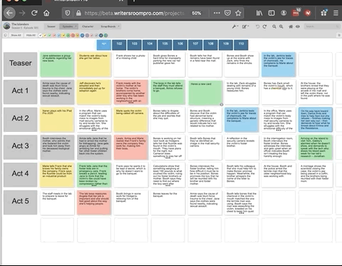 Also, because WritersRoom Pro understands the workflow of the writers' room, you can drag cards between other cards, which causes the cards to automatically shift to make space for the new card. Move a card from between two cards and those cards will shift to close the gap. And if you want to leave a gap between cards you can do that as well by holding the option key as you drag the card away.